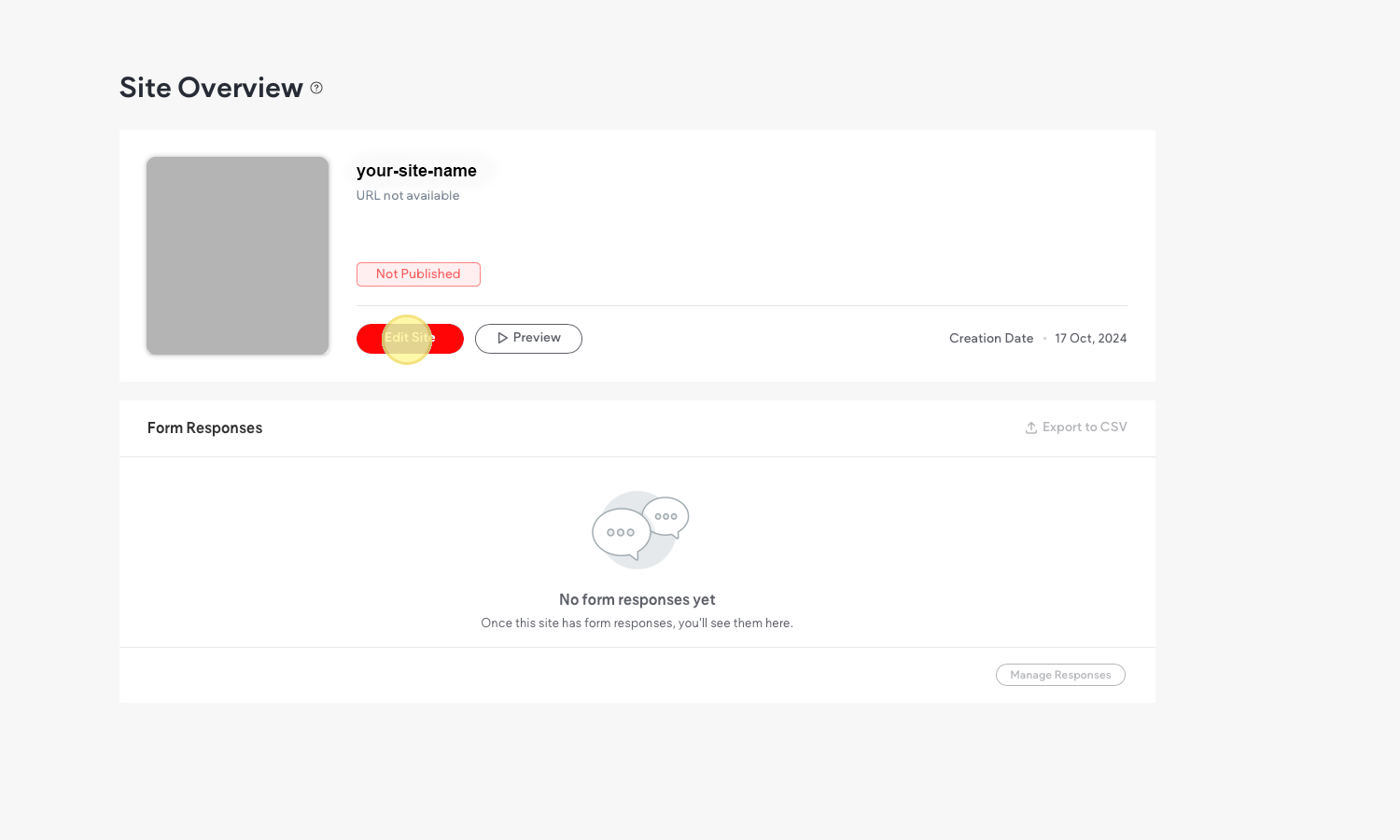 From this dashboard you will be able to edit your site, view form responses and see statistics after your website is live. For now you only have the ability to leave comments.